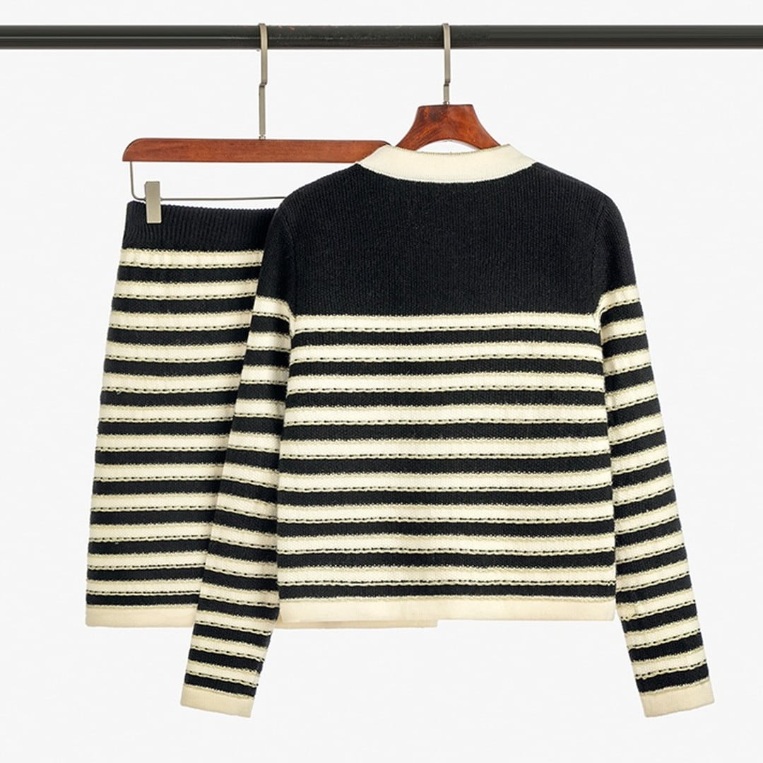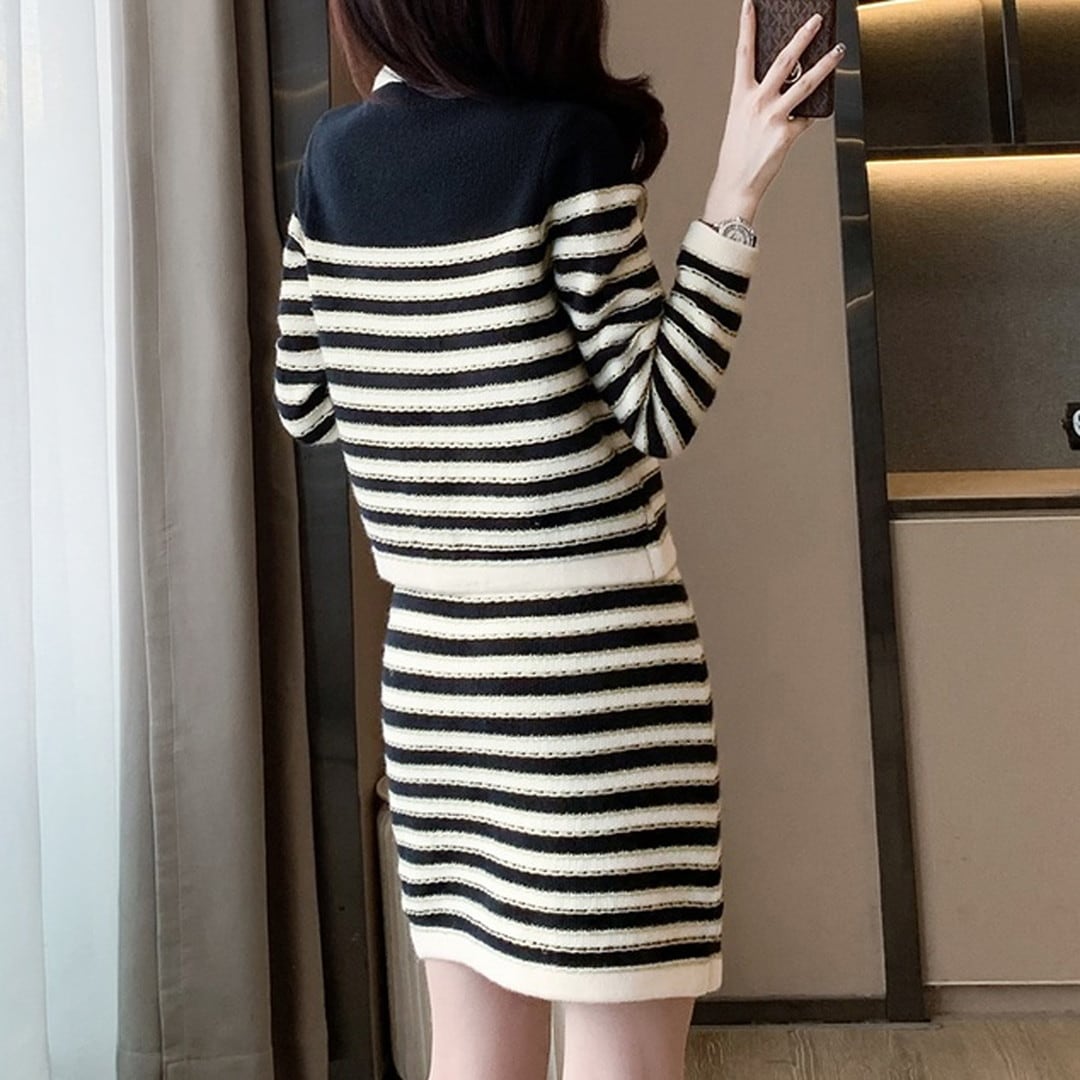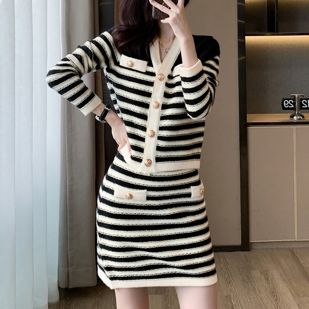 Spring/Autumn Two-piece V-neck Striped Knit Cardigan Short Skirt V2248