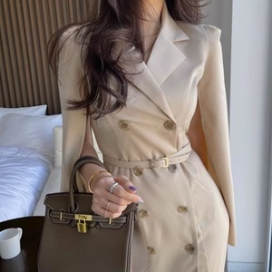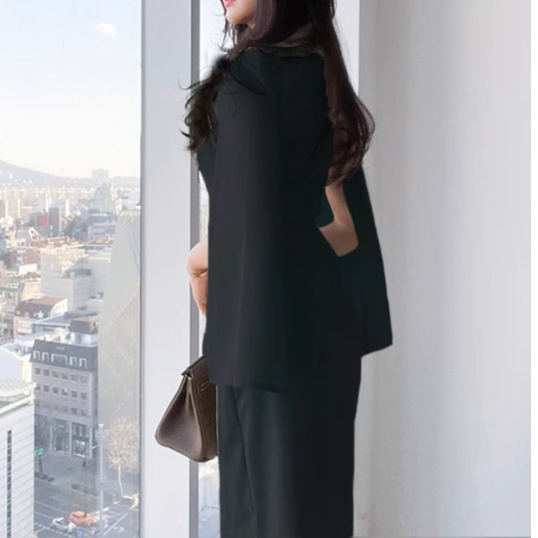 ダブルブレストがフォーマルな印象を与えつつ、ケープスリーブが女性らしさをプラス。