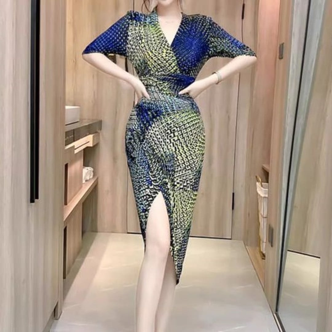 V-Neck Slim Fit Slit Skirt Tight Dress(3color) V339