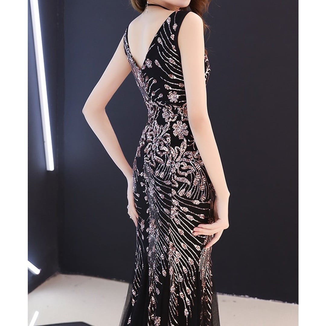 即納ありV-Neck Slim Sequined Fishtail Evening Dress(2color) V994