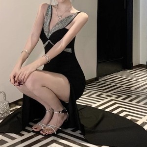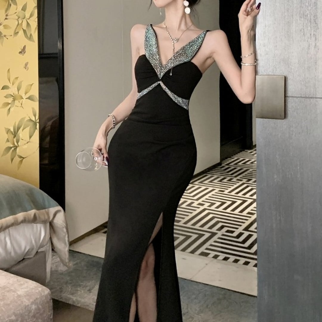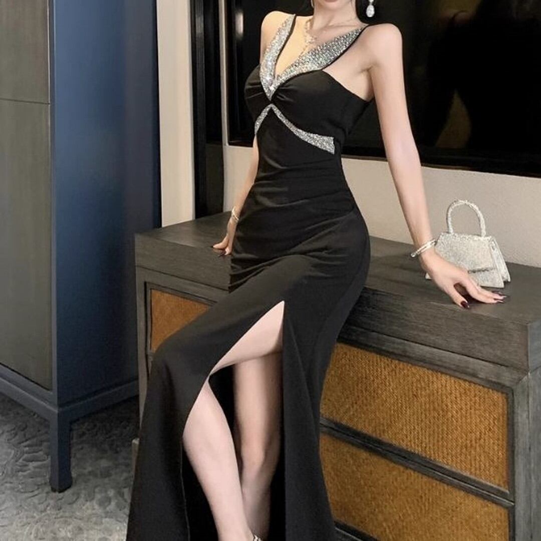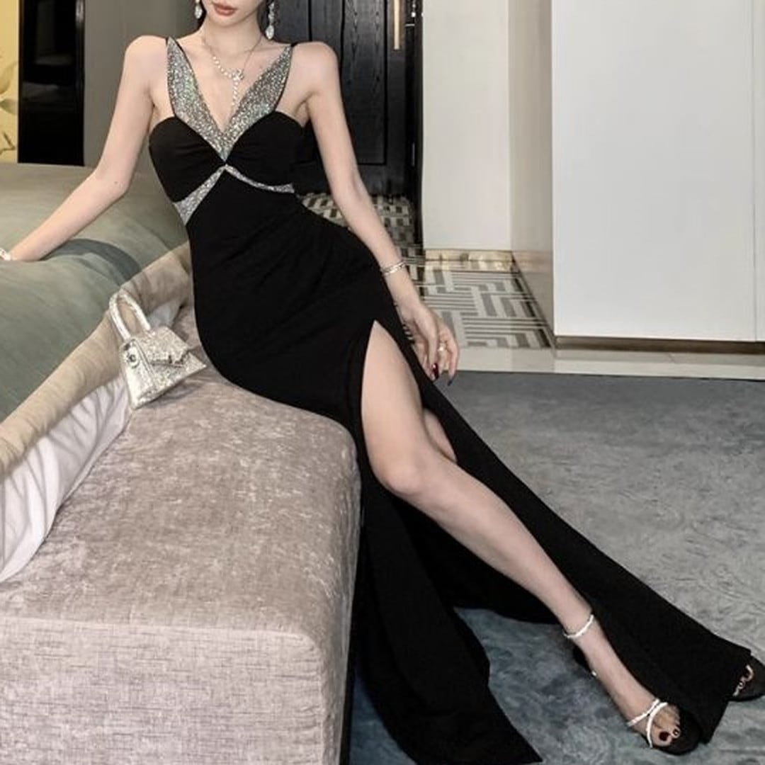 輝くビーズの装飾が魅力的なロングドレス。マーメイドラインが女性の美しいボディラインを際立たせ、セクシーなスリットが大人の女性の色気を演出します。パーティーや特別な夜に、自信に満ちたスタイルを実現しませんか。