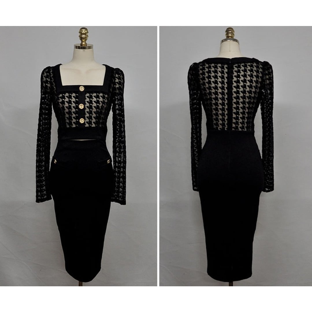 シアーなトップスとタイトスカートの組み合わせが、女性らしいシルエットを美しく演出します。。